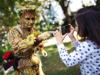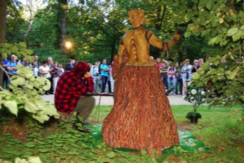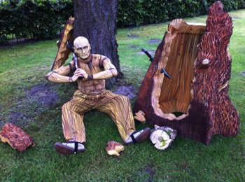 WOODY WOODman ist eine Holzfigur, die sich selbst aus einem Baumstamm schnitzt.